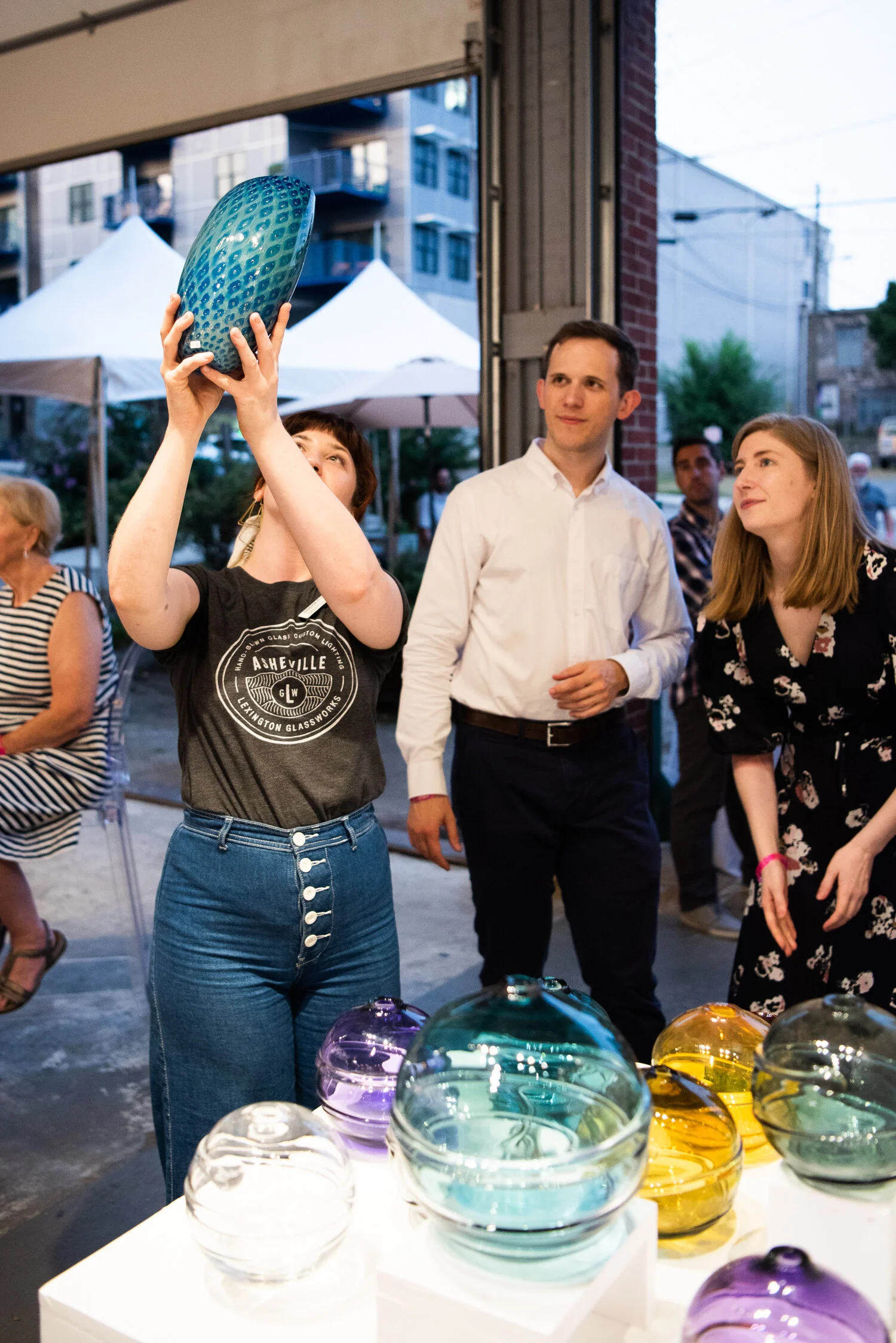 Fire It Up! was one of my favorite of these events. Local area chefs and makers joined forces at Lexington Glassworks in downtown Asheville to cook up tasty bites inspired by the colors of the pieces in the gallery by using the heat of the molten glass in the glassmakers’ studio as their kitchen. It was unbelievably cool. Chef Annie Pettry of Decca roasted up onions both on pools of molten glass and inside of lava-hot vase-in-progress to oohs and aahs of the crowd, but perhaps the most exhilarating moment was when glass artist John Miguel Almaguer blew Mother Earth Spirits through a bowl-in-progress to create a giant, gorgeous fireball.